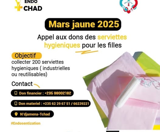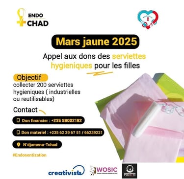En prélude de notre campagne "𝐉'𝐚𝐠𝐢𝐬 𝐜𝐨𝐧𝐭𝐫𝐞 𝐥'𝐞𝐧𝐝𝐨𝐦𝐞́𝐭𝐫𝐢𝐨𝐬𝐞 ", nous lançons un appel aux dons de serviettes hygiéniques ( industrielles et/ou réutilisables). L'endométriose est une maladie intimement liée aux règles, et cette action vise à améliorer l'hygiène menstruelle des filles. Les serviettes collectées seront distribuées aux filles dans les établissements scolaires où seront organisées des causeries éducatives sur l' endométriose et les menstruations.